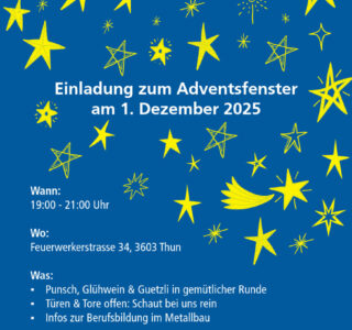 Wann: 01. Dezember 2025 zwischen 19:00 und 21:00 Uhr Wo: Feuerwerkerstrasse 34, 3603 Thun Was: Punsch, Glühwein & Guetzli in gemütlicher Runde Türen & Tore offen: Schaut bei uns rein […]